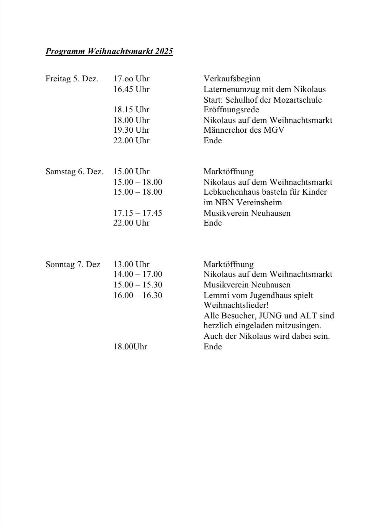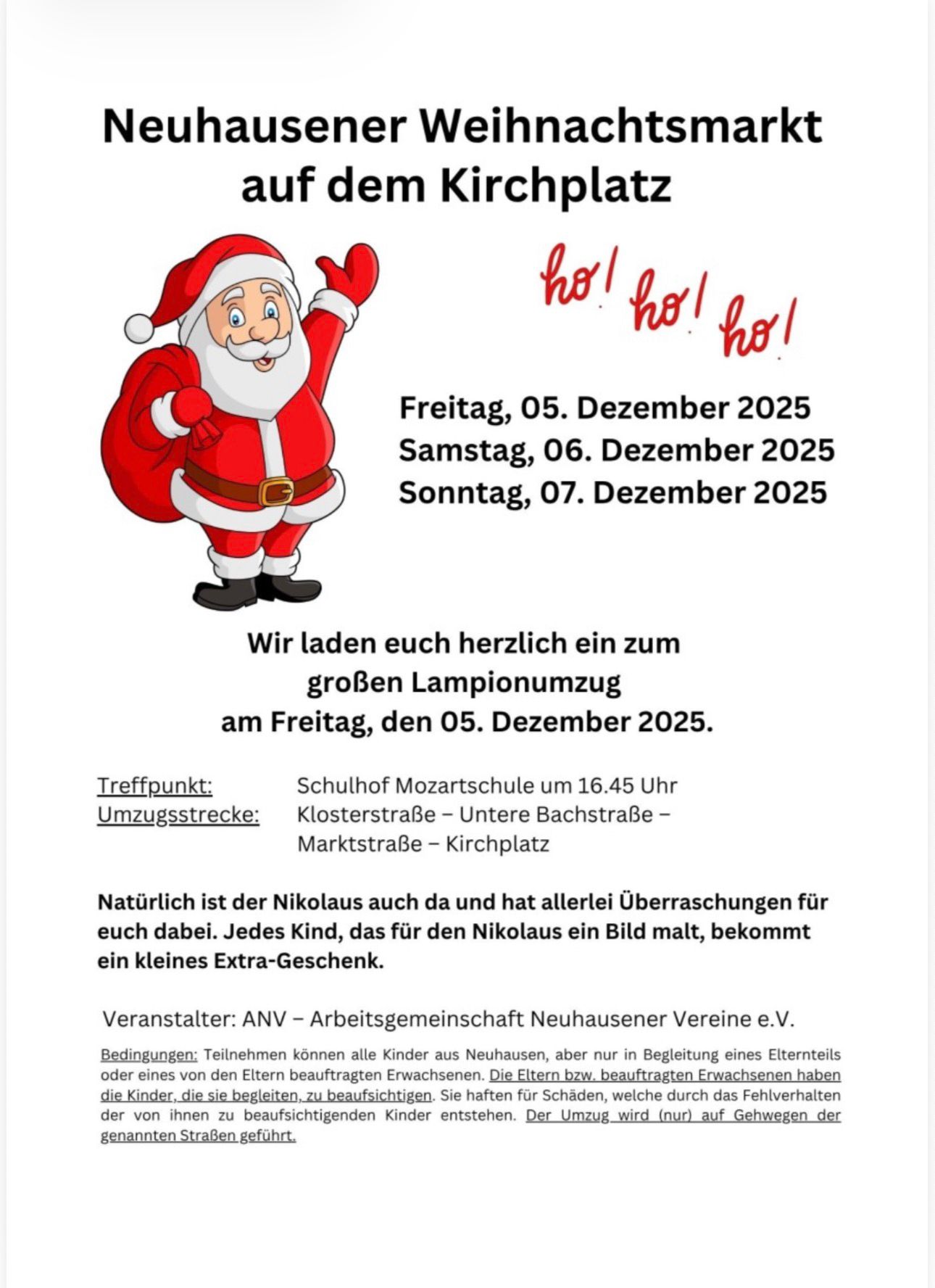 Neuhausener Weihnachtsmarkt vom 05. - 07.12.2025 mit großem Lampionumzug am 05.12.2025